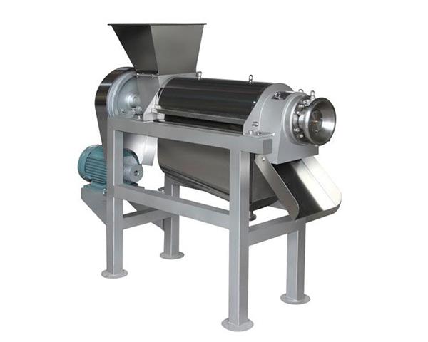 由于螺杆的底径沿出渣口方向逐渐增大,螺距逐渐减小,当物料被螺杆推动时,螺杆腔的体积减小,形成物料的挤压。从进料斗到渣槽看,螺旋轴的滚动方向为顺时针方向。物料进入进料斗,在螺杆的推动下被压紧。压榨后的果汁通过滤网流入底部的果汁容器,废物通过螺杆和调压锥之间形成的环形空间排出。空间大小可通过调压头沿轴向移动进行调整。顺时针使用(当滚动手轮的轴承座从设备的排渣槽向进料斗端看时,调压头向左时,空隙减小,反之,空隙变大),改变空隙大小,即调整排渣阻力,可以改变排渣率。但是,如果开放空间太小,在强挤压下,一些渣粒将与果汁一起通过过滤网挤出。虽然添加了果汁,但果汁的质量相对降低。开放空间的大小应取决于用户的详细技术要求。从而达到主动分离果汁和残渣的目的。